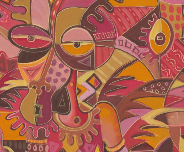 Angu Walters has woven a tapestry of life, embracing geometric harmony and surreal imagination. The vibrant hues and rhythmic patterns reflect a community pulsating with energy and unity.