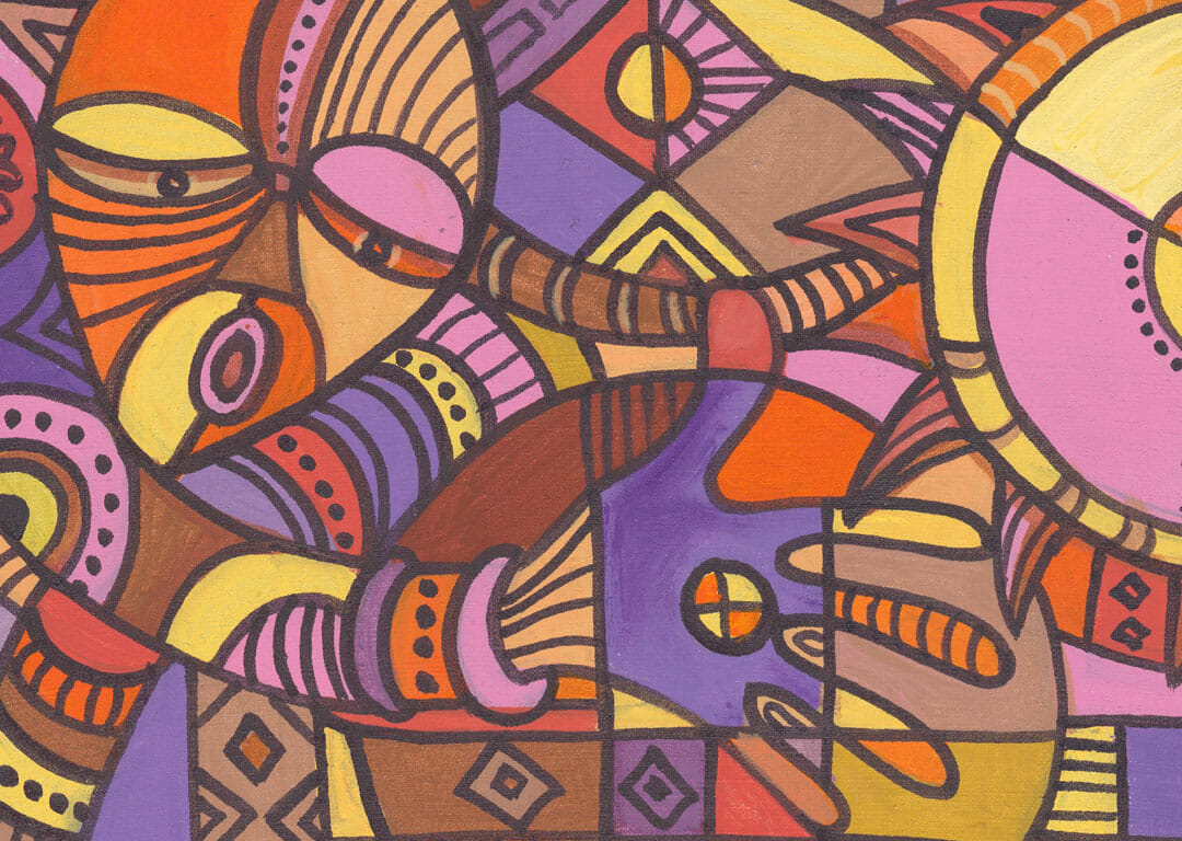 Bright orange and blue acrylic painting of an African drum player.