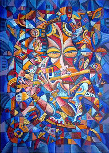 This original oil painting is of a musician playing the flute in Africa.